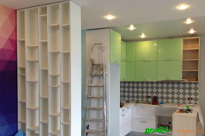 Продолжаем зонировать помещение многоуровневой полкой из панелей МДФ.