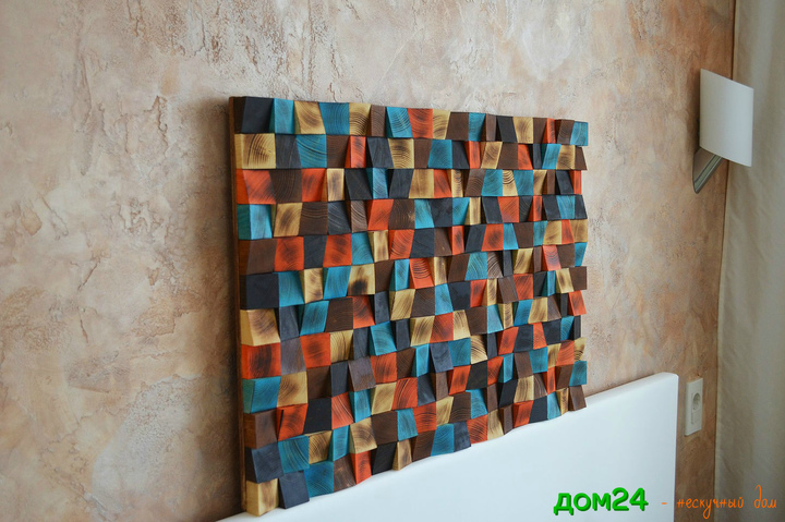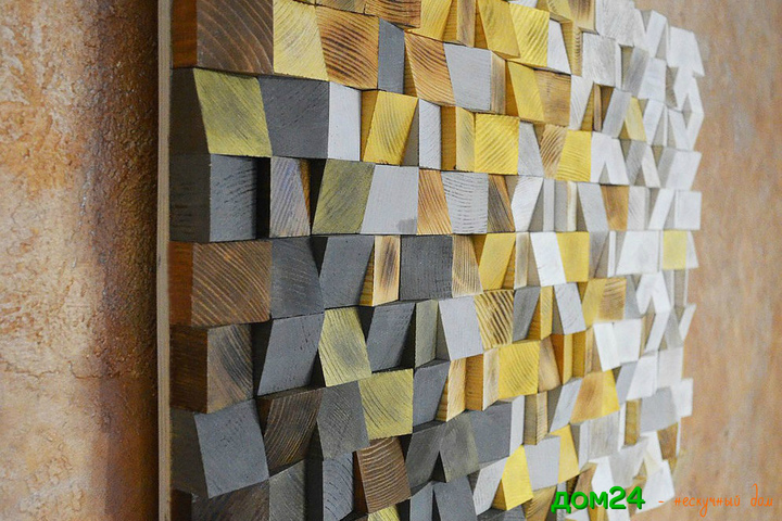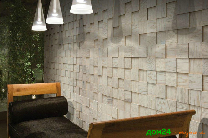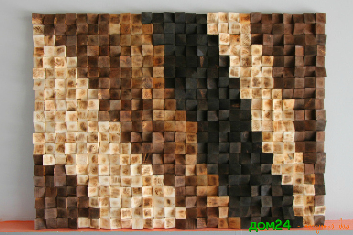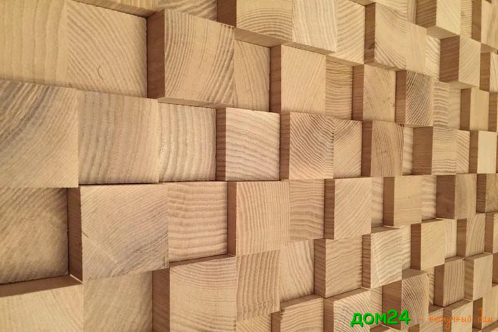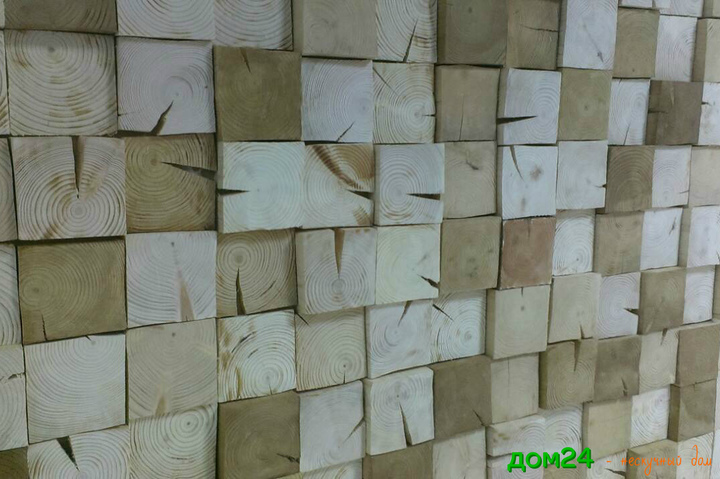 Облицовка стены отшлифованными спилами из строганного массива сосны (100 х 100 мм) толщиной 2, 3 см.
